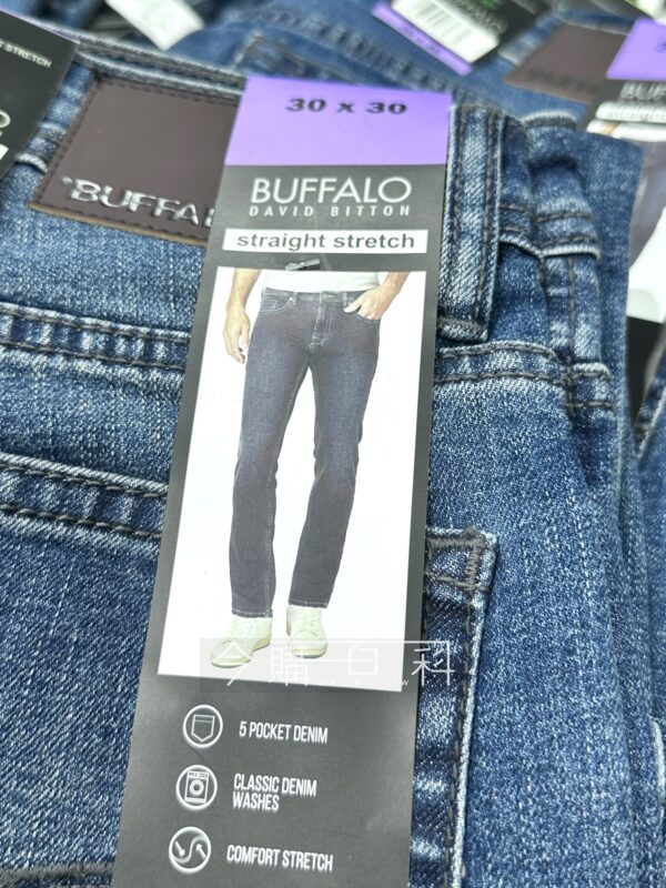 74%棉製,穿著柔軟舒適,經典五口袋彈性牛仔褲,使用回收材料製成聚脂纖維。