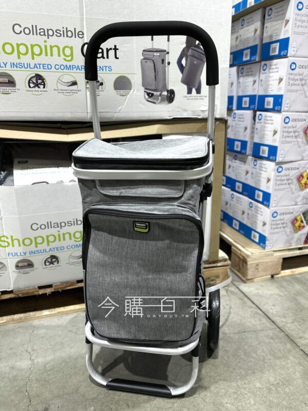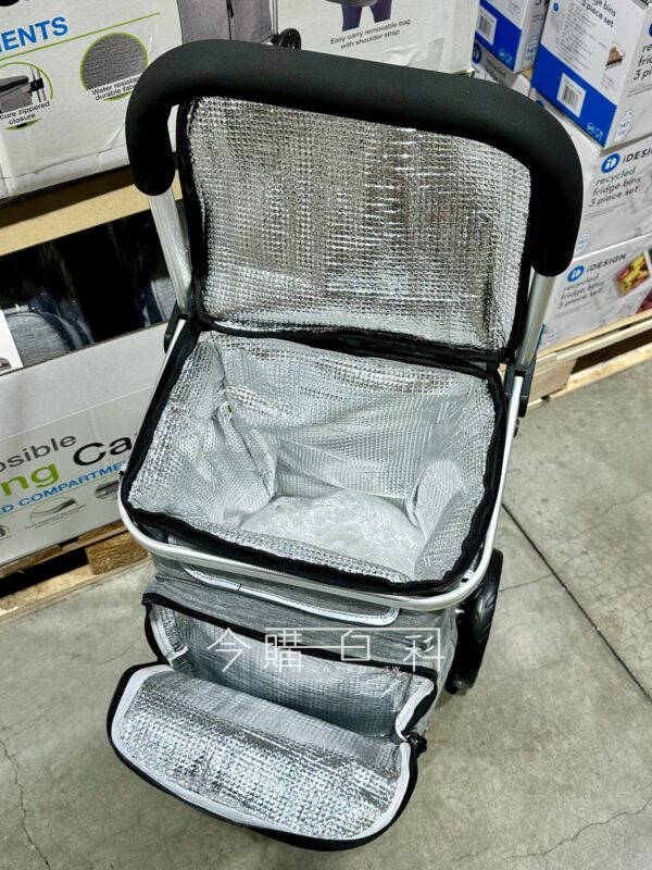 大容量的保冷購物袋,車架耐重:約25公斤,購物袋背帶可調整長度,購物袋表面防潑水材質,折疊式車架好收納,把手舒適好握,輪胎加寬移動更穩定,收納隔層設計。