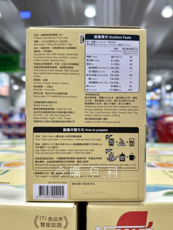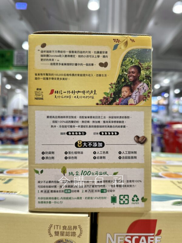 使用100%紐西蘭奶粉,新配方奶粉含量增加,改使用天然香料,NESCAFE獨特咖啡萃取技術,完整保留咖啡香氣,無添加糖及奶精,口感濃厚。