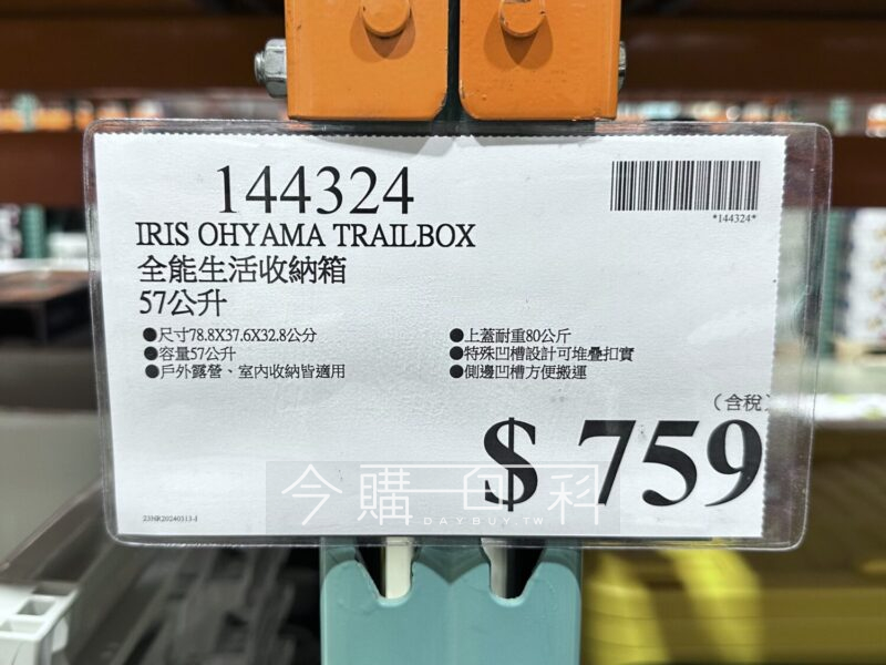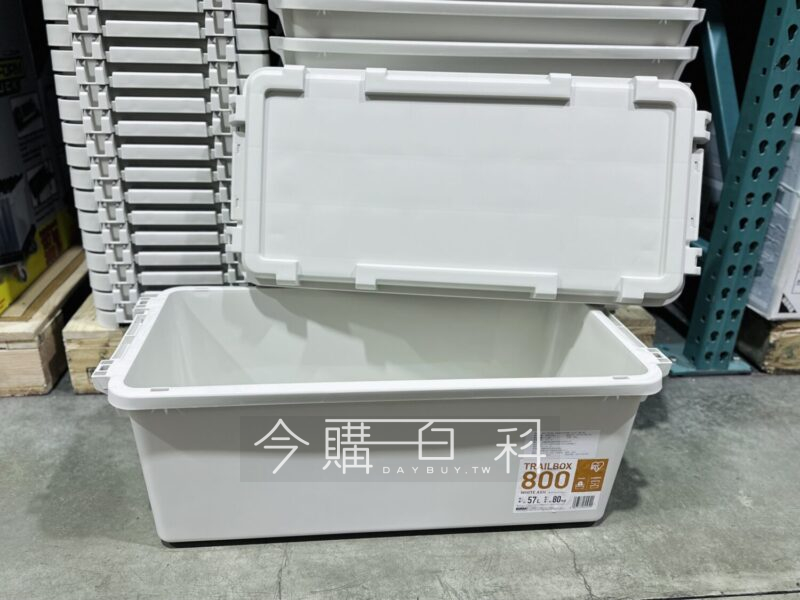 尺寸78.8*37.6*32.8公分,容量57公升,戶外露營、室內收納皆適用,上蓋耐重80公斤,特殊凹槽設計可堆疊扣實,側邊凹槽方便搬運。