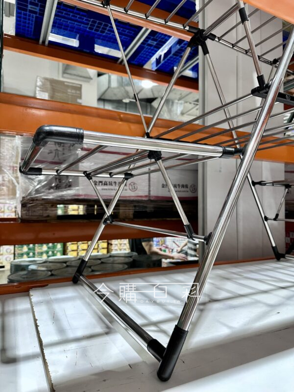 尺寸:長158公分、寬70公分、高197公分,不鏽鋼材質,承重25公斤,中闁橫槓可以立高,不使用時可折疊收起,展開可曬被單、棉被。