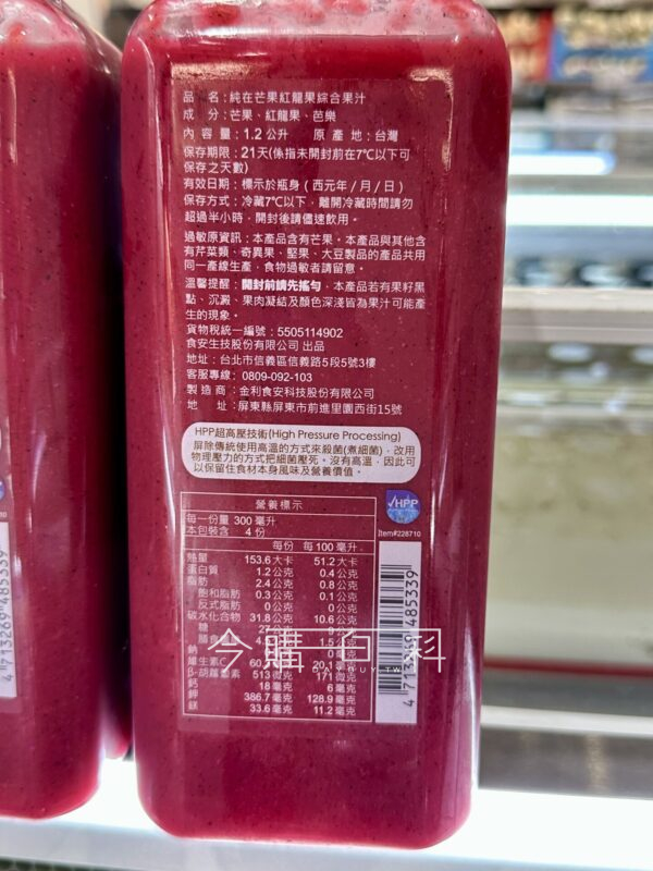 100%果汁含有率,使用高壓低溫殺菌,使用非濃縮還原果汁,無添加糖,無添加人工香料與色素。