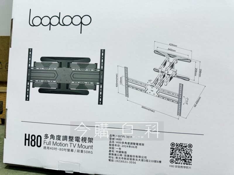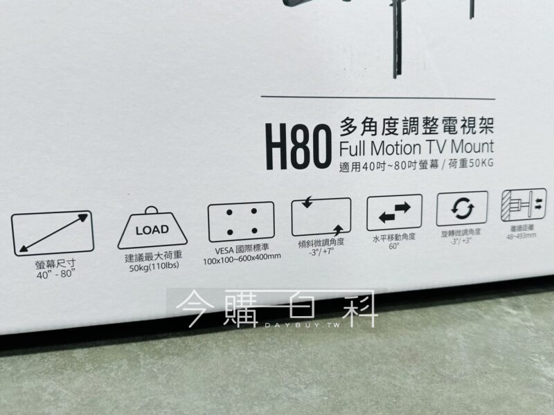 適用孔距600*400MM以內,前傾後仰+7~-3度,線材遮蓋板/承重50KG,水平旋轉60度,離牆距離4.78CM,非人為損壞一年保固。
