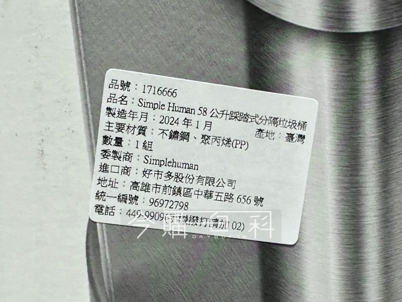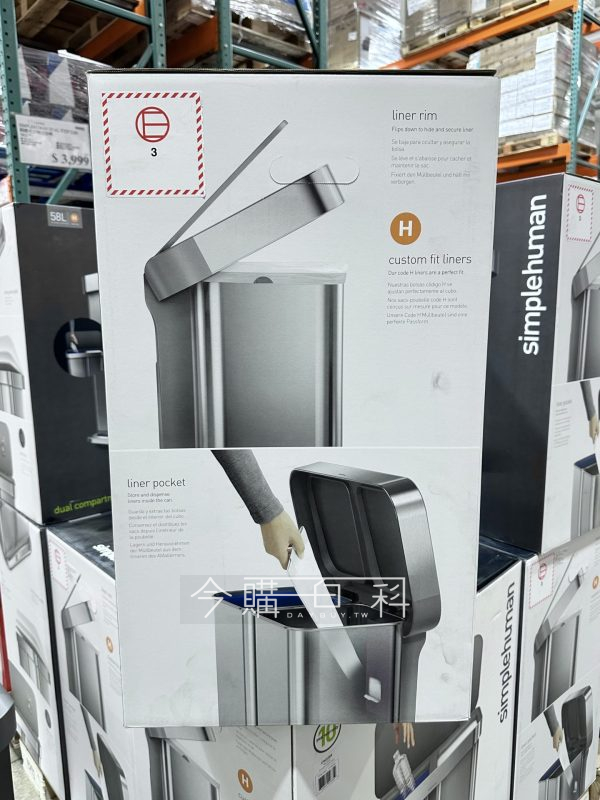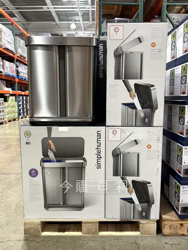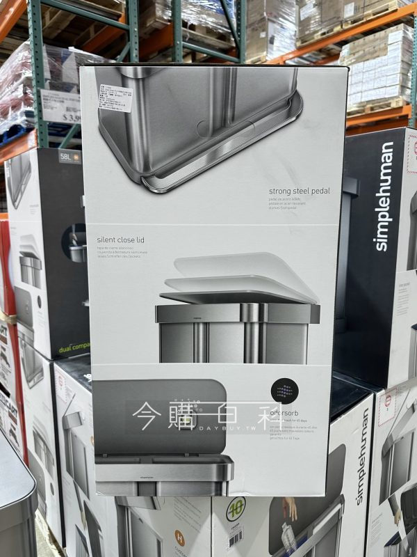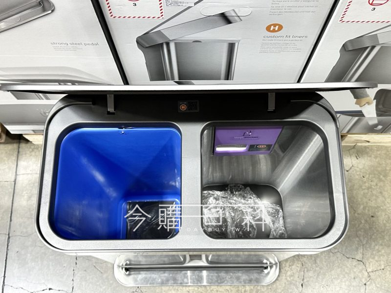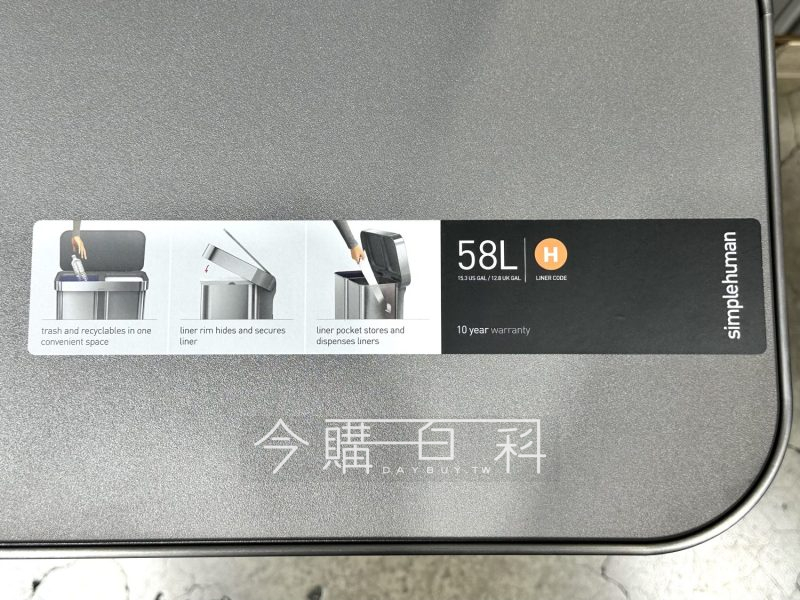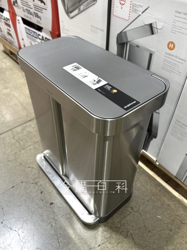 容量:58公升,雙層分隔設計好分類,靜音緩降桶蓋,附垃圾袋收納盒,銀離子塗層防止指紋殘留,簡潔時尚外觀設計。