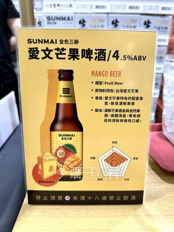 以小麥啤酒為基底,加入台灣愛文芒果釀造,濃郁的果香,呈現香甜的口感,豐富的果香平衡啤酒的層次,尾韻圓潤飽滿的芒果香。