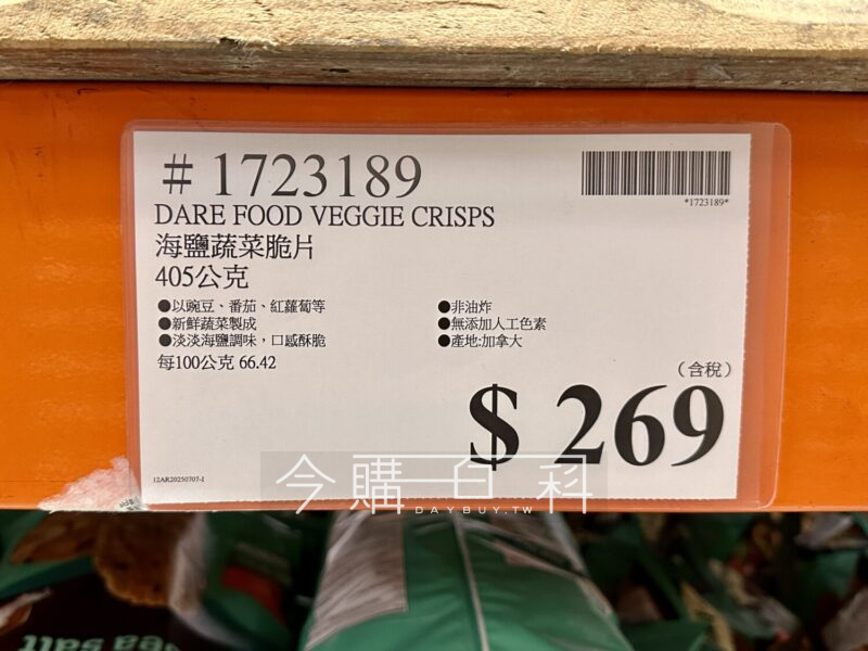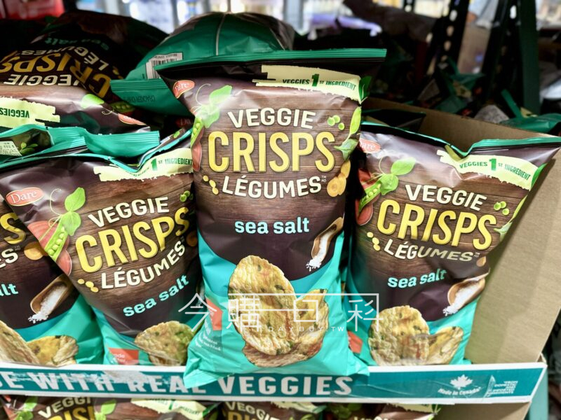 以碗豆、番茄、紅蘿蔔等新鮮蔬菜製成,淡淡海鹽調味,口感酥脆,非油炸,無添加人工色素,產地:加拿大。