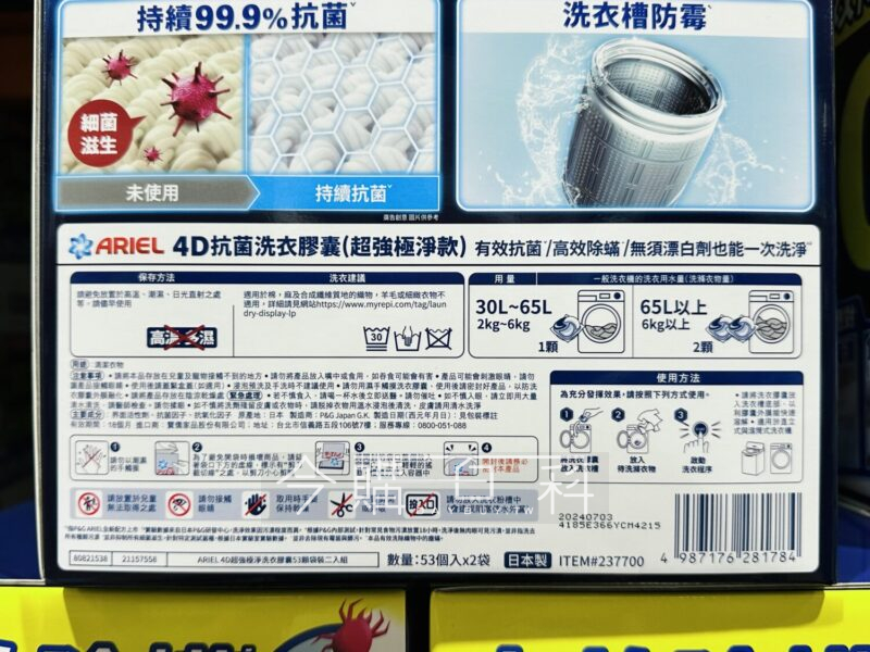 抗菌抗蟎雙重防護,深入纖維,根源潔淨,一般洗衣量僅需用一顆膠囊,99%抗菌,洗後持續抗菌,添加抗氧化抗臭因子,超濃縮配方用量省。