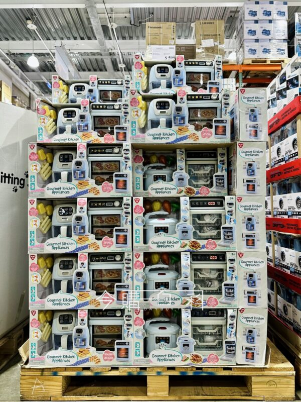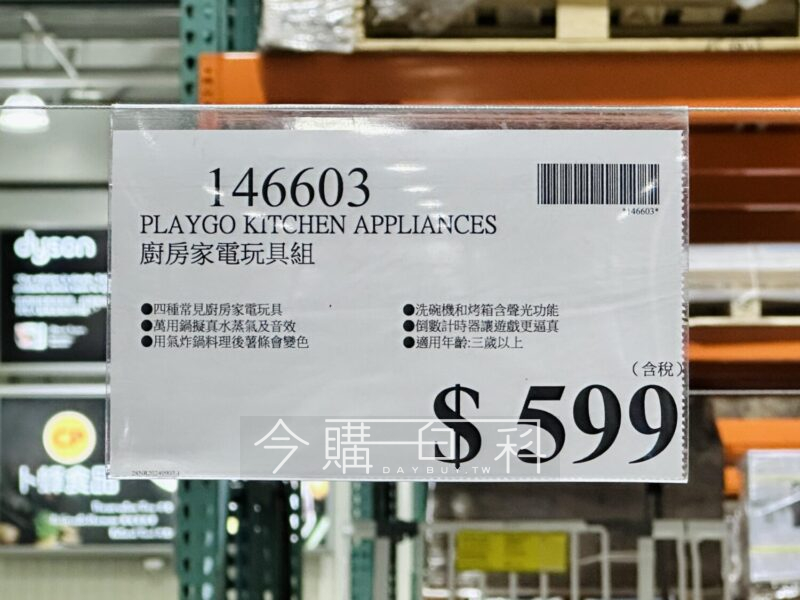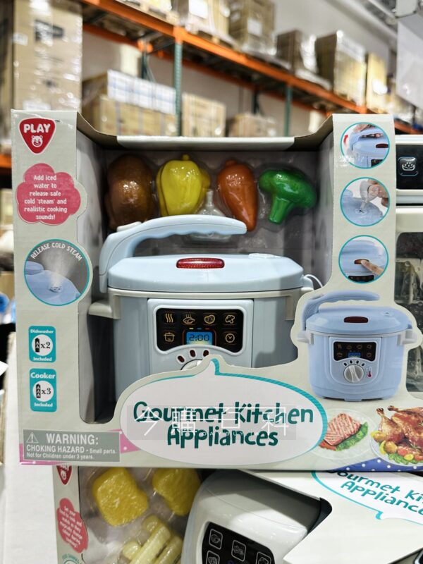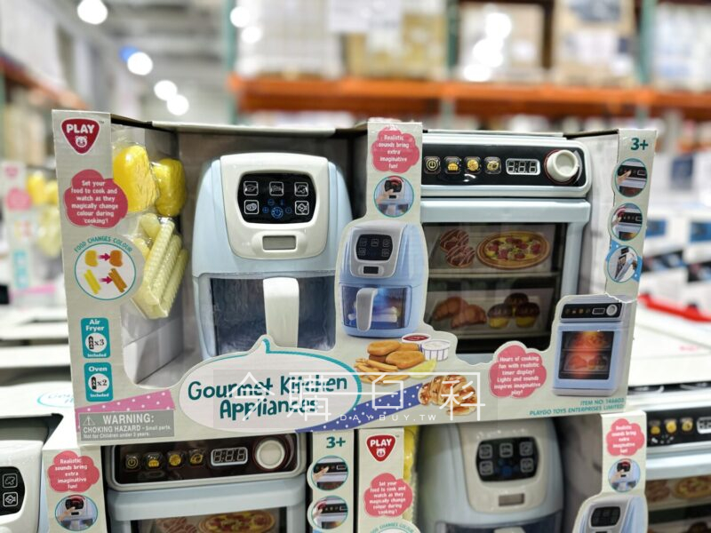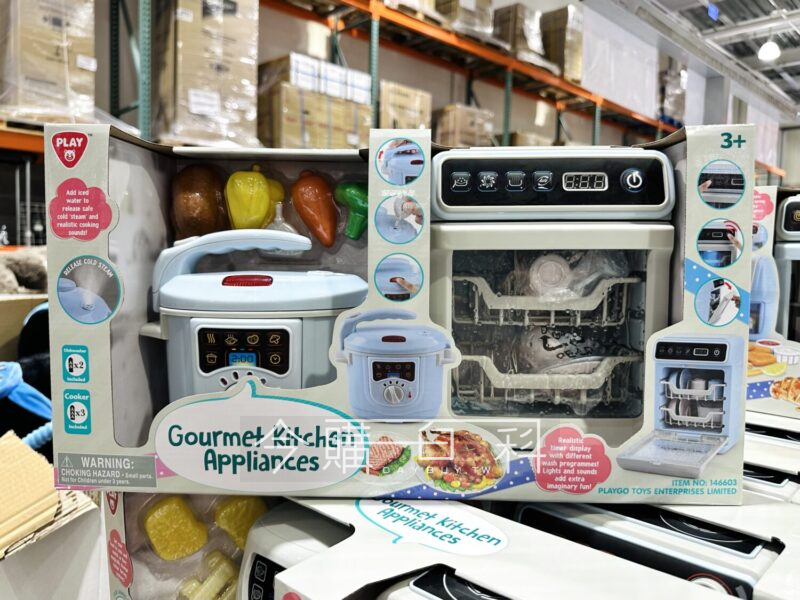 四種常見廚房家電玩具,萬用鍋擬真水蒸氣及音效,用氣炸鍋料理後薯條會變色,洗碗機和烤箱含聲光功能,倒數計時器讓遊戲更逼真,適用年齡:三歲以上。