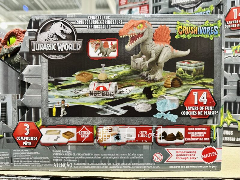 轉動大恐龍尾巴並按下按鈕,可轉動腦袋或張大嘴巴,從果凍中救出小恐龍並餵食,包裝可作為遊戲背景裝飾,網購另售小恐龍補充包,適用年齡:四歲以上。