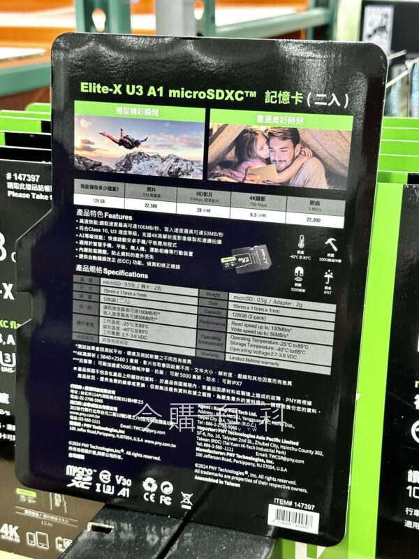 終身有限保固,支援4K UHD錄影,等級A1/U3/V30/C10/UHS-I,讀取速度最高可達100MB/S,寫入速度最高可達50MB/S,附SD轉接卡一卡兩用。