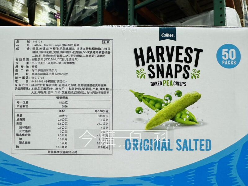 薄鹽調味簡單美味,非油炸,低糖健康新選擇,全素可食,無麩質豌豆脆果,優質纖維來源,共50小包,方便隨時享用。