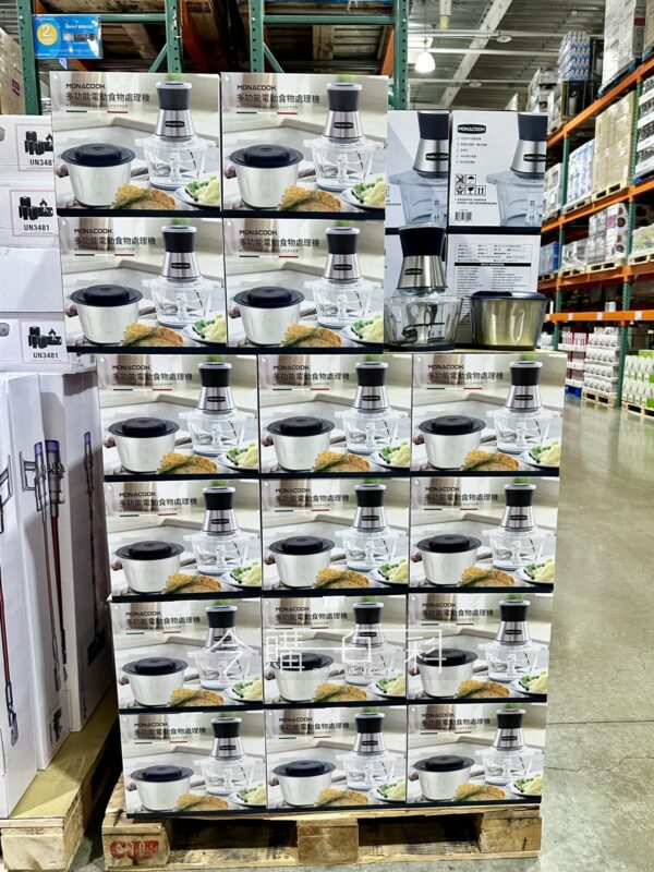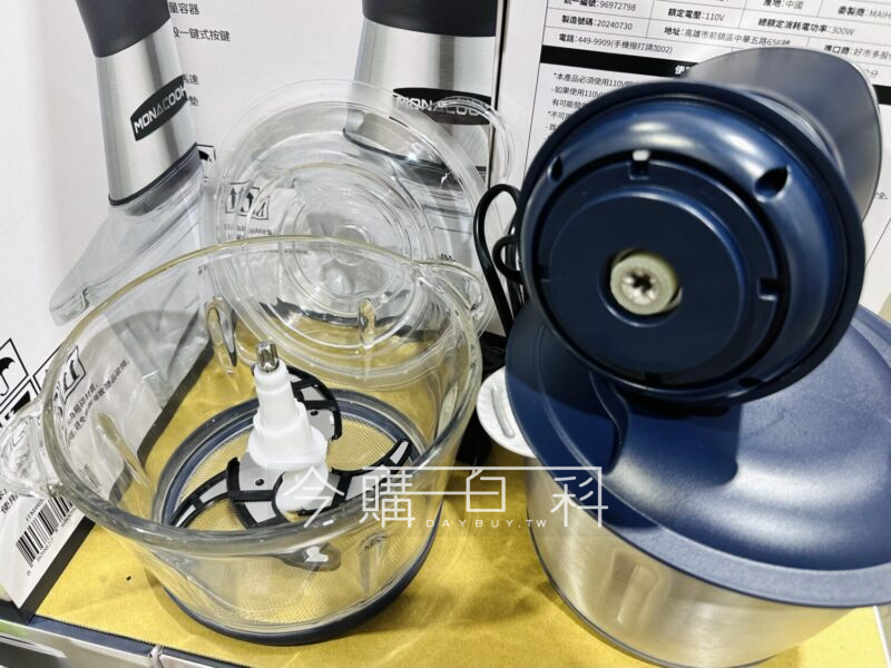 300W消耗功率,適用於絞肉、切碎、研磨、攪拌、剥皮、混合食材,碗底部安全防滑墊,含塑膠碗、不鏽鋼碗各一、削皮器*1、刀片*2。