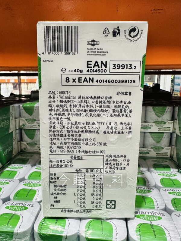 VELAMINTS為德國品牌,三層口味設計,清新持久,含有碳酸氫鈉成分,金屬包裝,可放置於桌上,每罐有16塊口香糖,請儲存於陰涼,乾燥處。