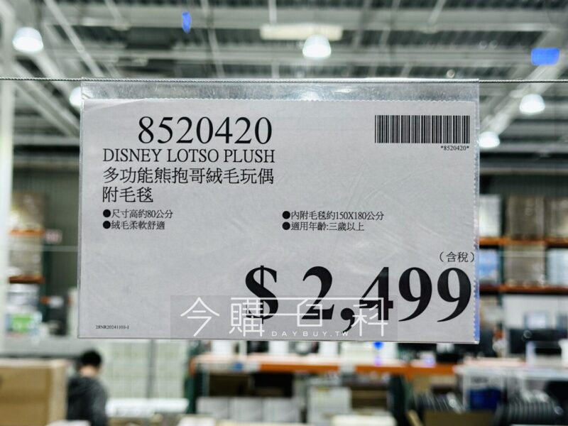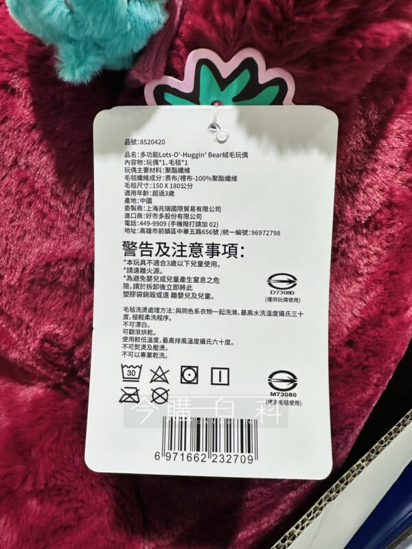 尺寸高約80公分,絨毛柔軟舒適,內附毛毯約150*180公分,適用年齡:三歲以上。