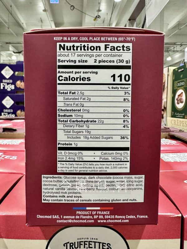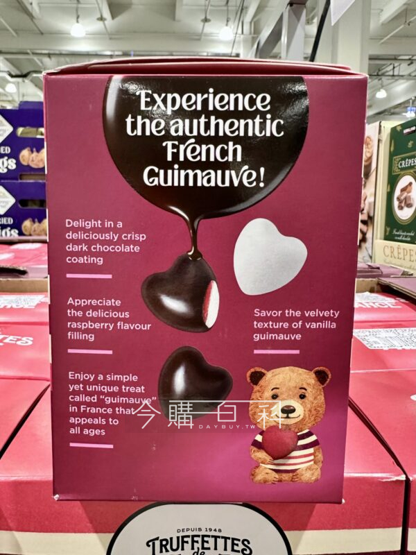 黑巧克力包覆棉花糖,內含濃郁覆盆莓果醬,口感層次豐富不膩口,單入包裝適合分享,絲滑順口,經典美味,原產地:法國。