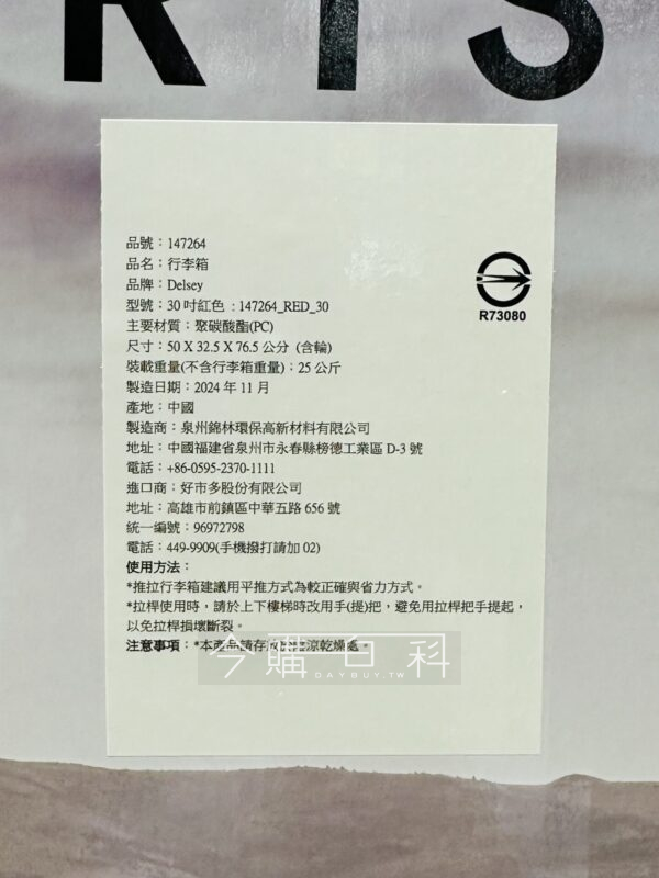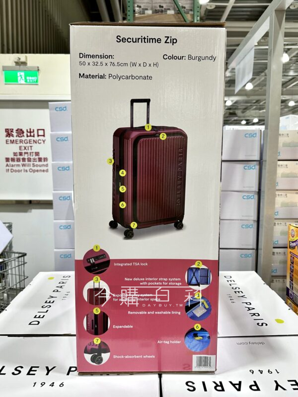 國際通用TSA海關密碼鎖,前開式設計、深度可擴充,360度滑順靜音輪,100%PC材質製成,內部束帶與拉鍊隔層設計,含輪約50.5*32*76.5公分。
