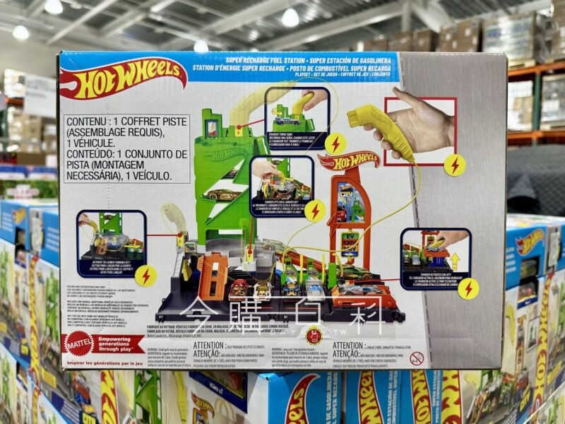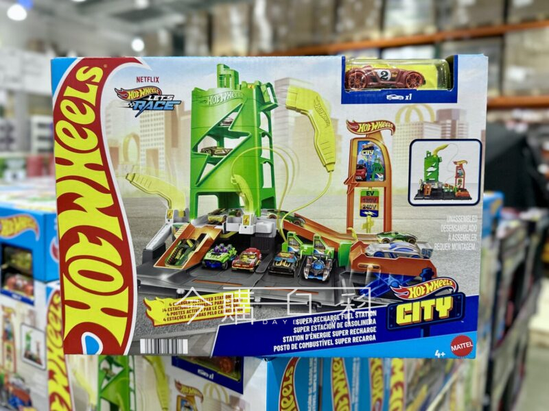汽車充電站模擬遊戲,可停放至少10台小汽車,軌道可讓1:64小車通過,適用年齡:四歲以上。