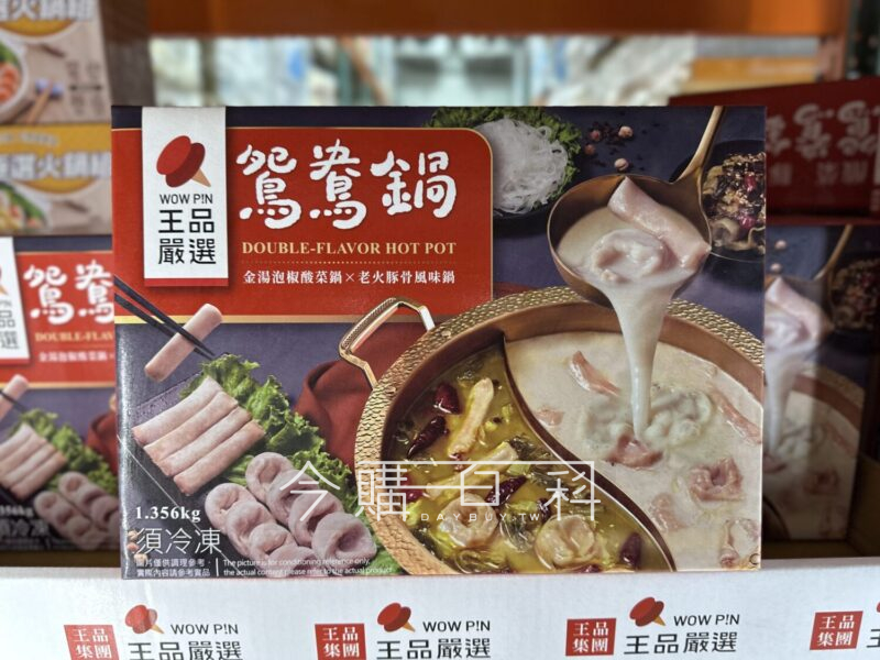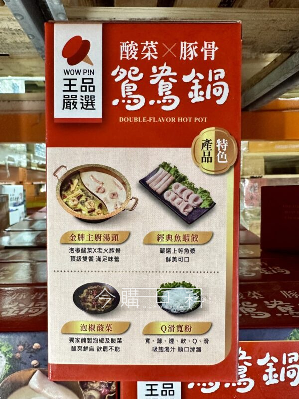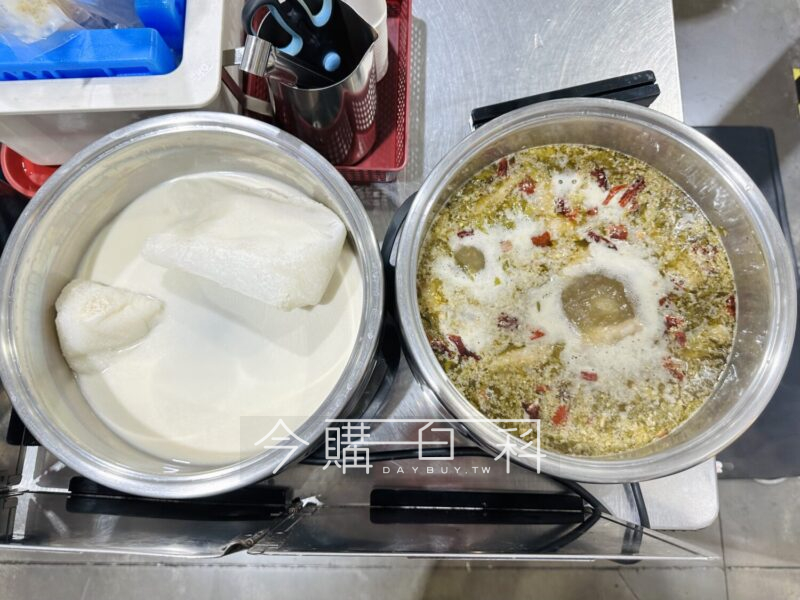 鴛鴦鍋組合,包含兩種湯底:金湯泡椒酸菜湯底、老火豚骨風味湯底,含魚餃、蝦餃、寬粉及酸菜,可依喜好添入蔬菜及肉品。