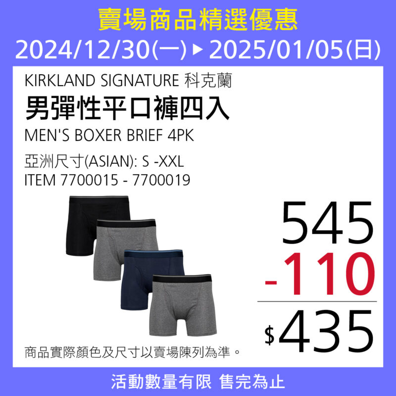 KIRKLAND SIGNATURE 科克蘭男彈性平口褲四入 #7700015~7700019