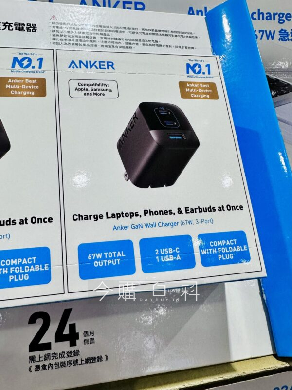 18個月保固,USB-C兩孔/USB-A一孔,氮化錠GAN技術,單孔最大輸出功率67W,雙孔最高65W輸出,折疊插頭方便攜帶。