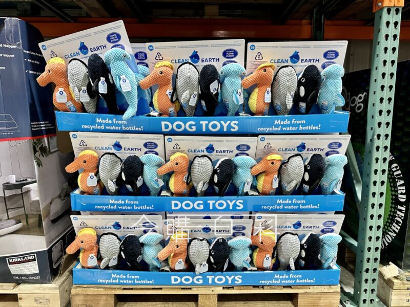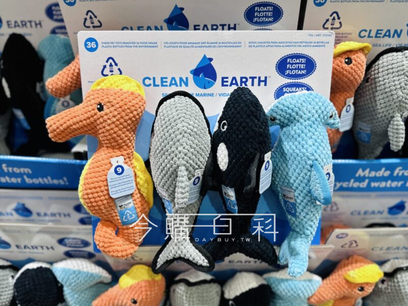 共4種海洋生物:海馬、鯨魚、虎鯨、錘頭鯊,每入玩具皆可發啾啾聲響,各由9個回收寶物瓶製成,輕量質地材料,可漂浮水面,適合陪伴狗狗游泳玩耍。