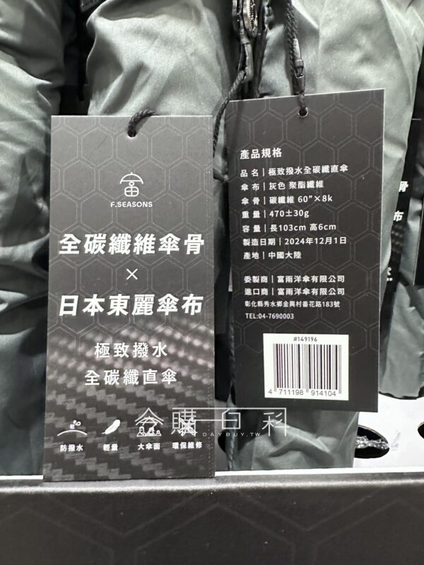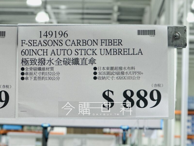 全骨碳纖維材質,傘面尺寸約152公分,傘下直徑約130公分,日本東麗超撥水布料,SGS測試5級撥水/UPF50+,收納尺寸:6*6*103公分。