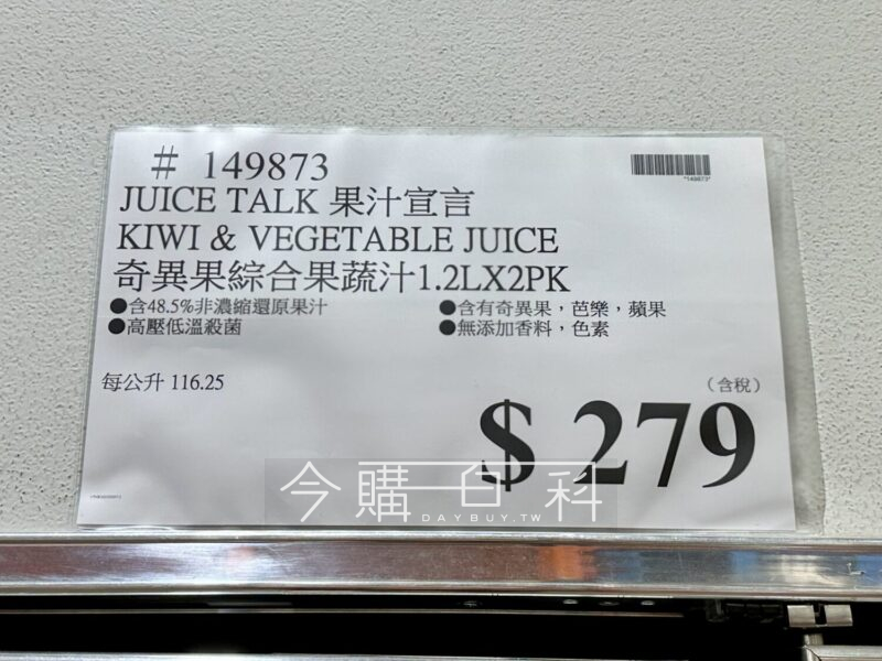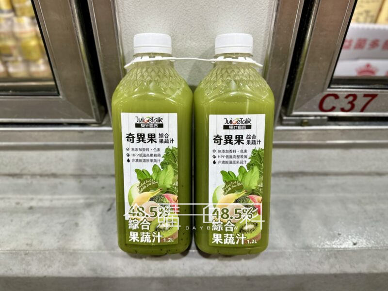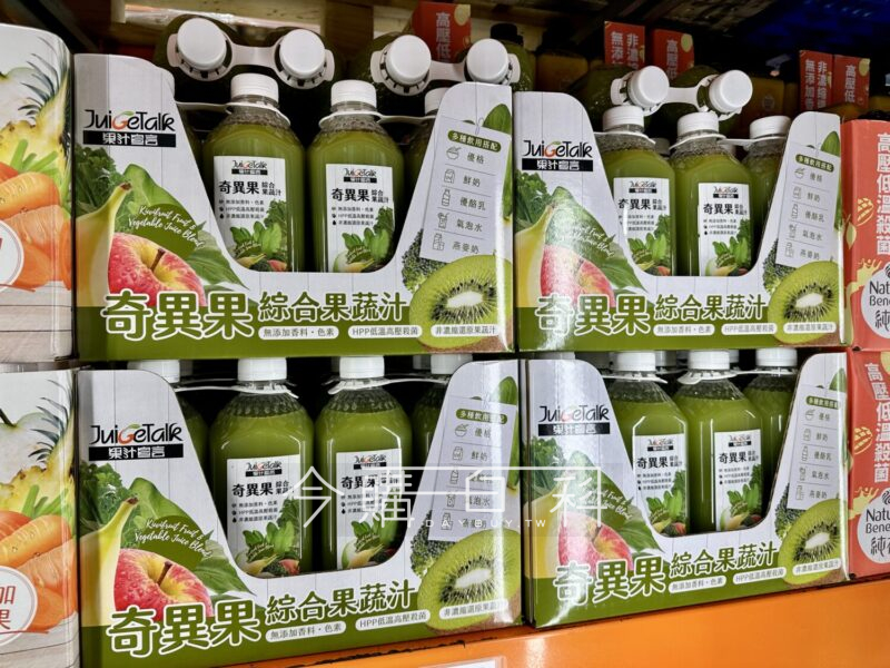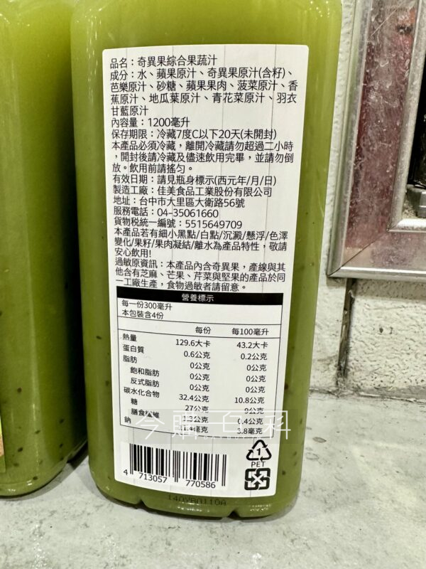 含48.5%非濃縮還原果汁,高壓低溫殺菌,含有奇異果、芭樂、蘋果,無添加香料,色素。