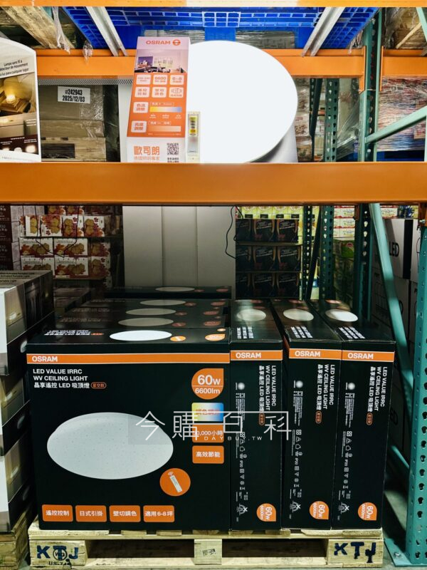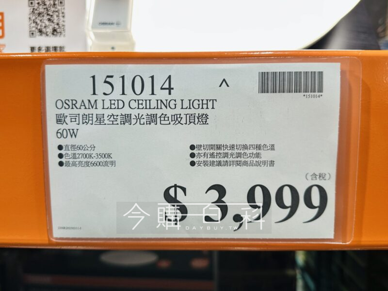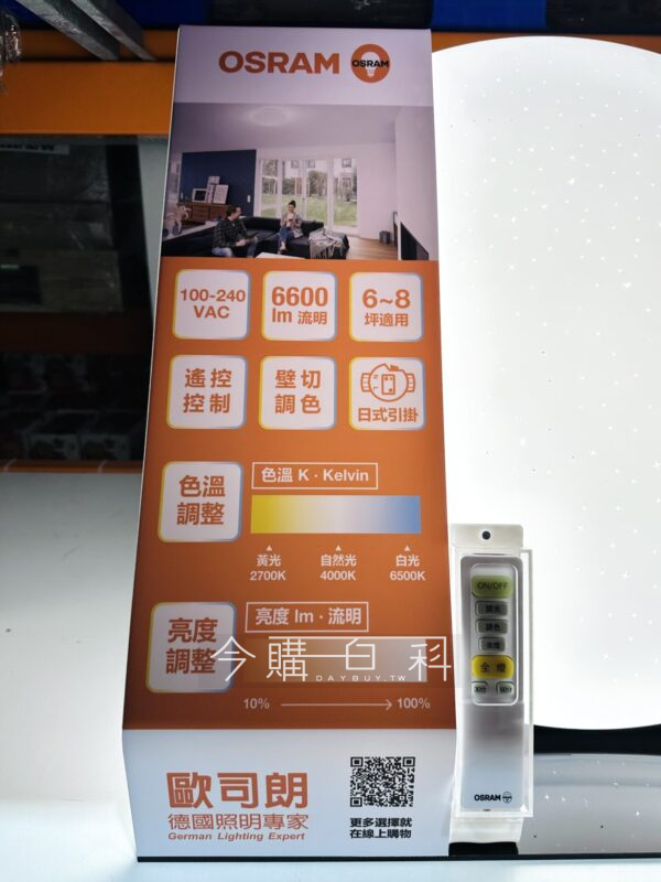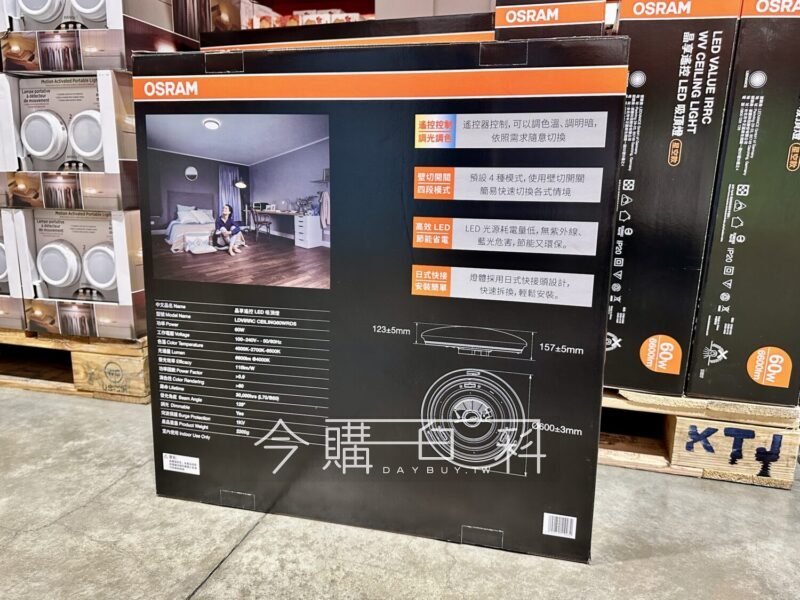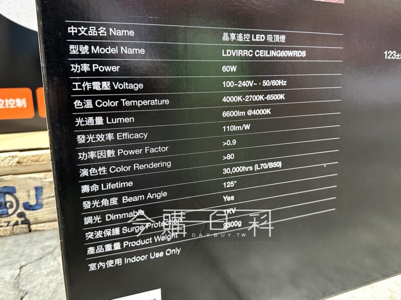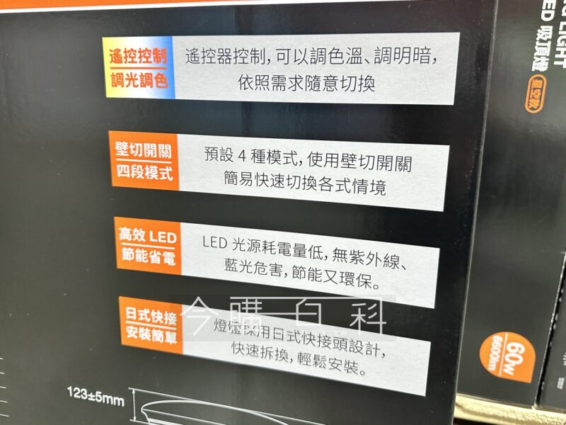直徑60公分,色溫2700K-3500K,最高亮度6600流明,壁切開關快速切換四種色溫,亦有遙控調光調色功能,安裝建議請詳閱商品說明書。