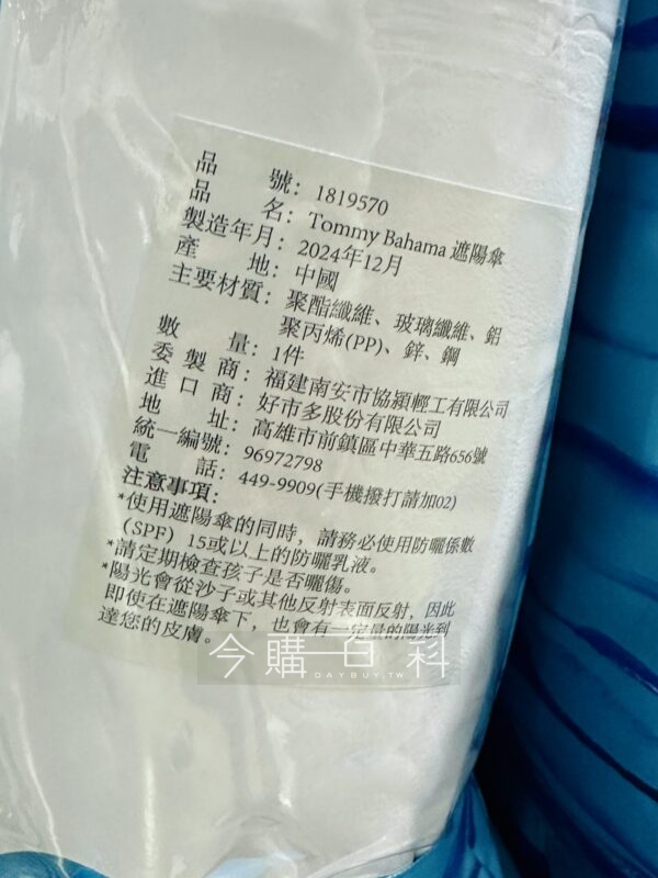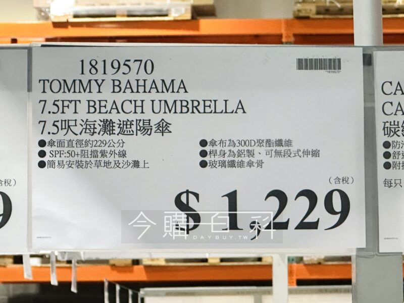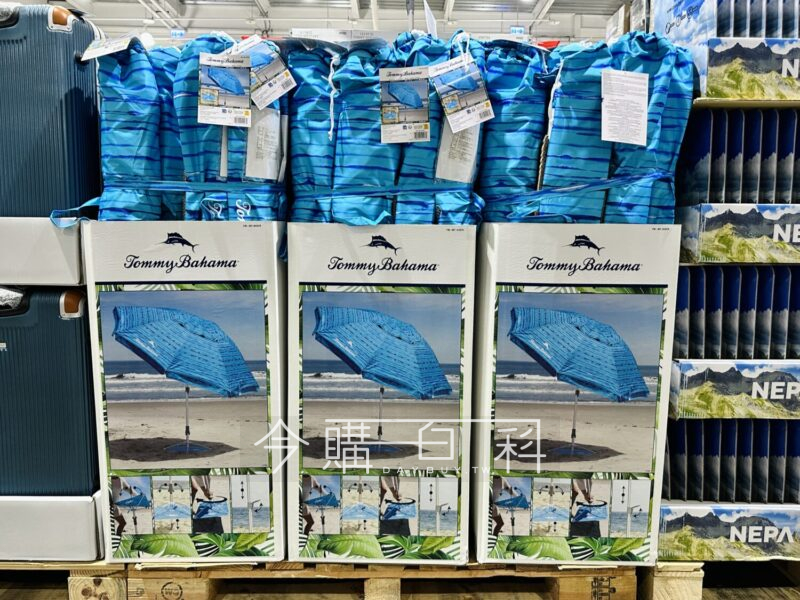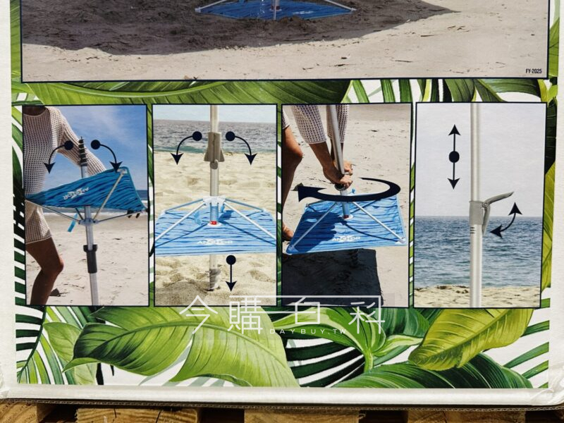 傘面直徑約229公分,SPF 50+阻擋紫外線,簡易安裝於草地及沙灘上,傘布為300D聚酯纖維,桿身為鋁製,可無段式伸縮,玻璃纖維傘骨。