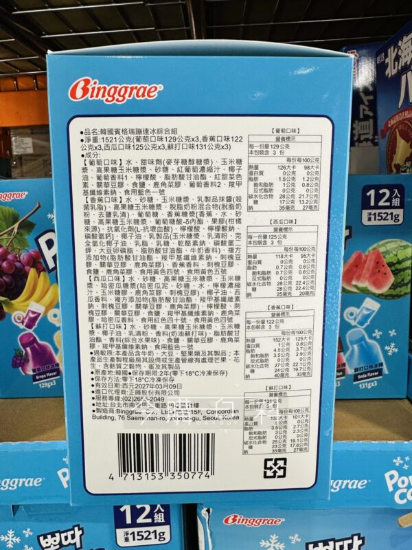 內含四種口味:葡萄口味、香蕉口味、西瓜口味、蘇打口味,韓國特色冰棒,酥脆爽口的冰沙口感,可直接吃或擠入杯中食用。