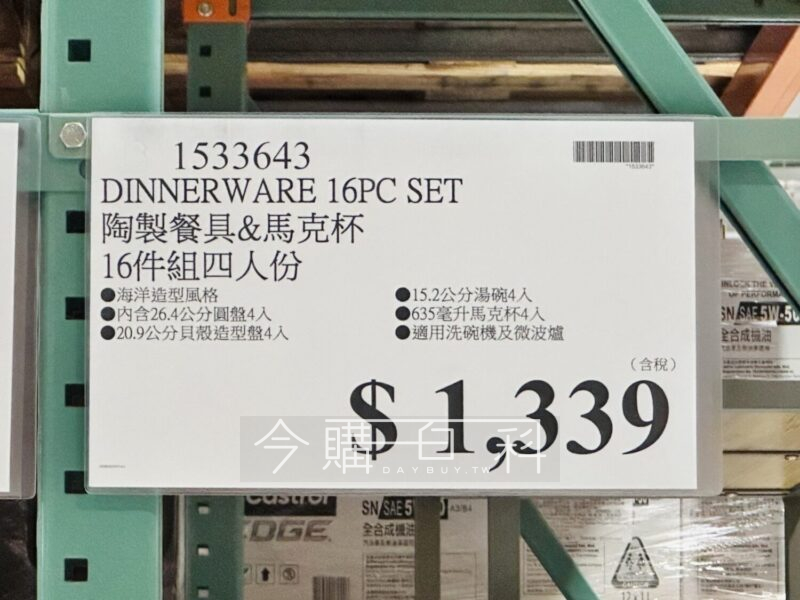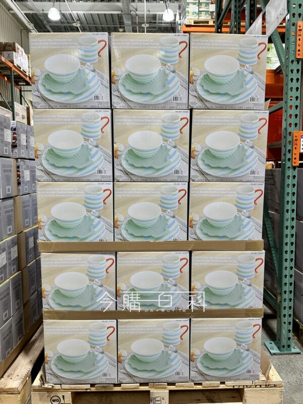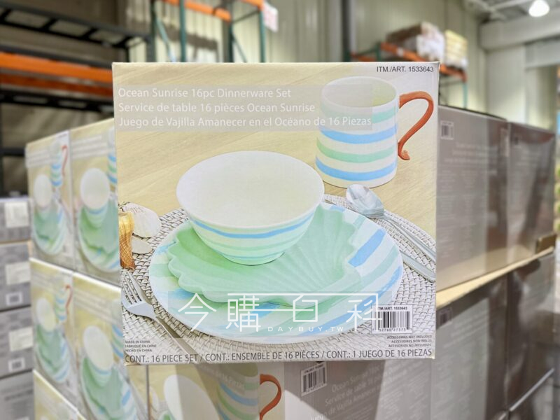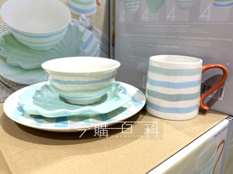 海洋造型風格,內含26.4公分圓盤4入、20.9公分貝殼造型盤4入、15.2公分湯碗4入、635毫升馬克杯4入,適用洗碗機及微波爐。