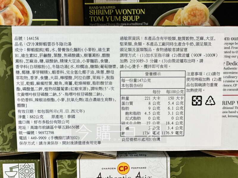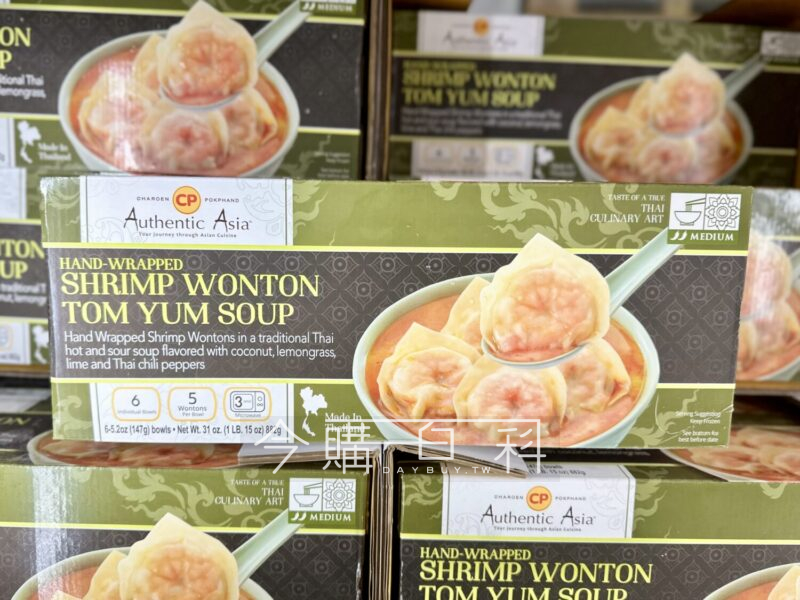 泰國傳統湯品,獨特的酸辣味以及香料味,搭配手工鮮蝦雲吞,簡單復熱,加水到碗裡,使用微波爐復熱即可食用,每組內含六碗雲吞冬陰功湯。