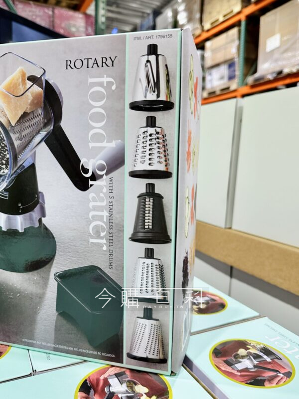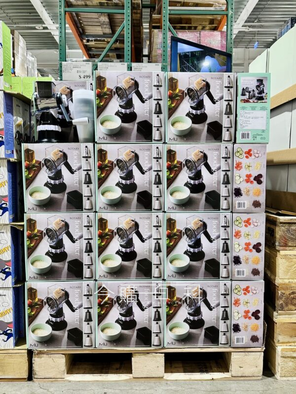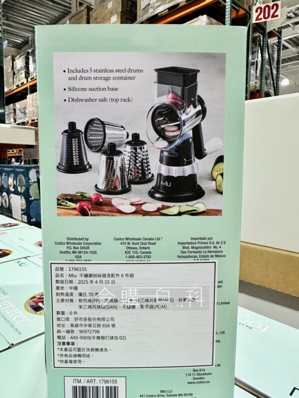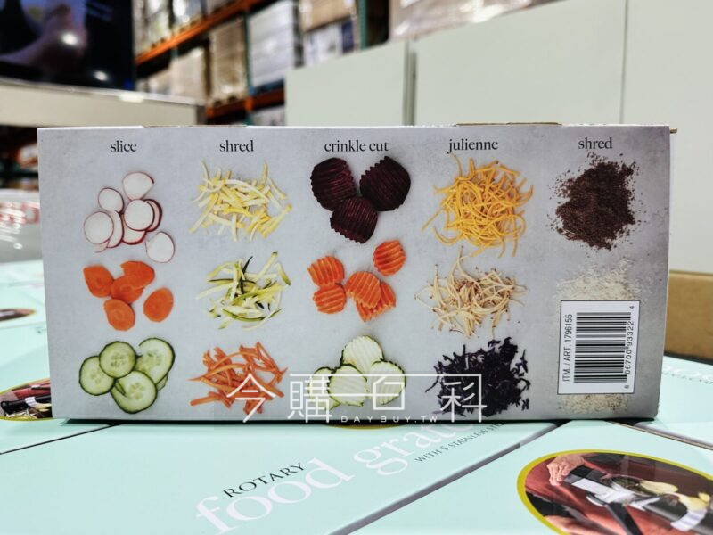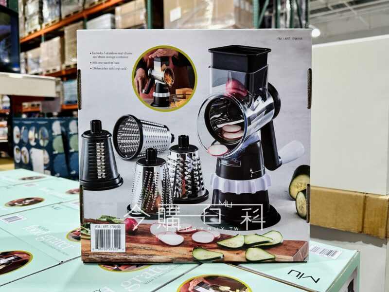 底部吸盤設計使用時不滑動,配件皆為不鏽鋼材質,配件可堆疊收納至杯中,內含主機、切條、切片、橫紋切片、切絲、磨粉配件各一入。