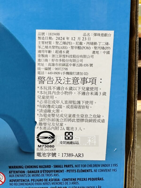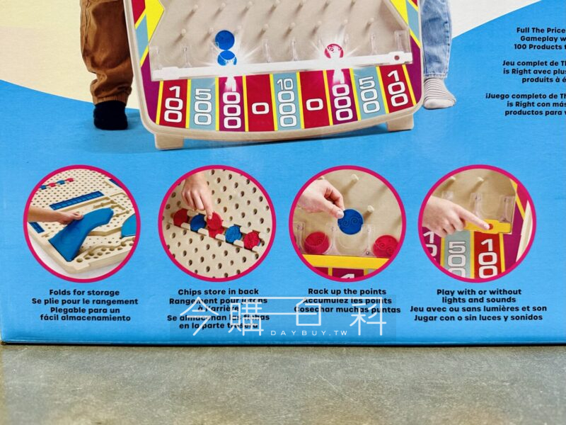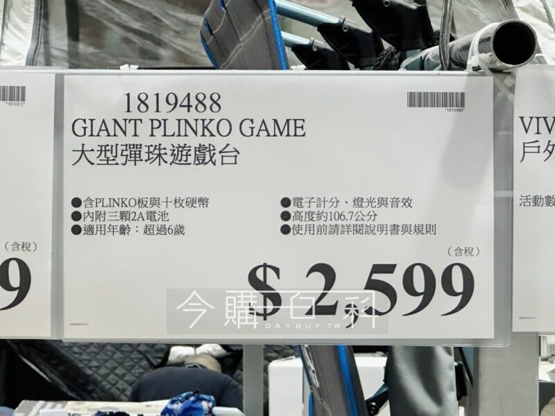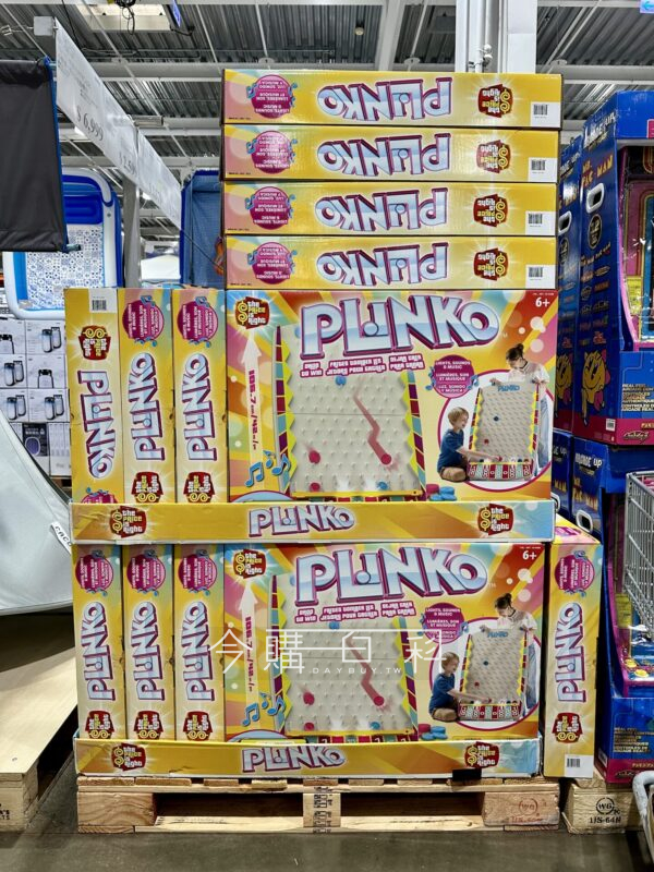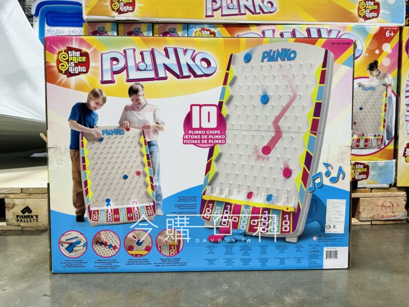 含PLINKO板與十梗硬幣,內附三顆2A電池,適用年齡:超過6歲,電子計分、燈光與音效,高度約106.7公分。