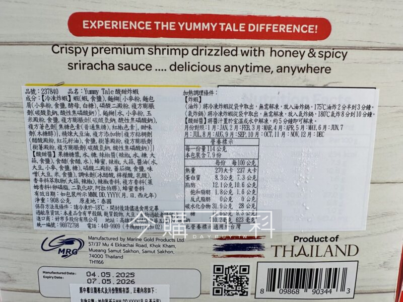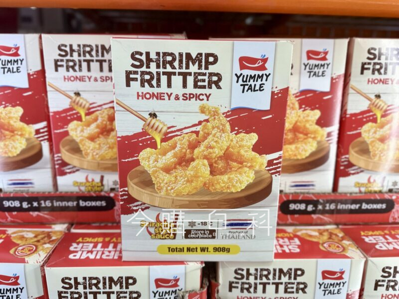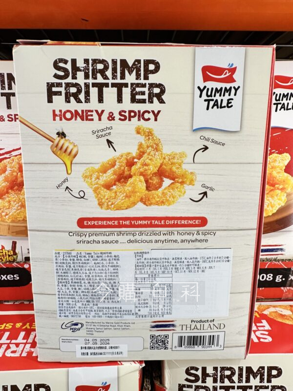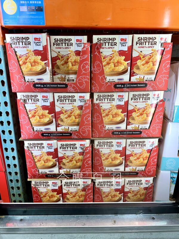 酥脆冷凍炸蝦,搭配香辣蜂蜜酸甜醬,兩袋蝦四包醬共908公克,炸蝦可油炸或氣炸鍋料理,酸甜醬置於室溫或水中解凍,產地:泰國。