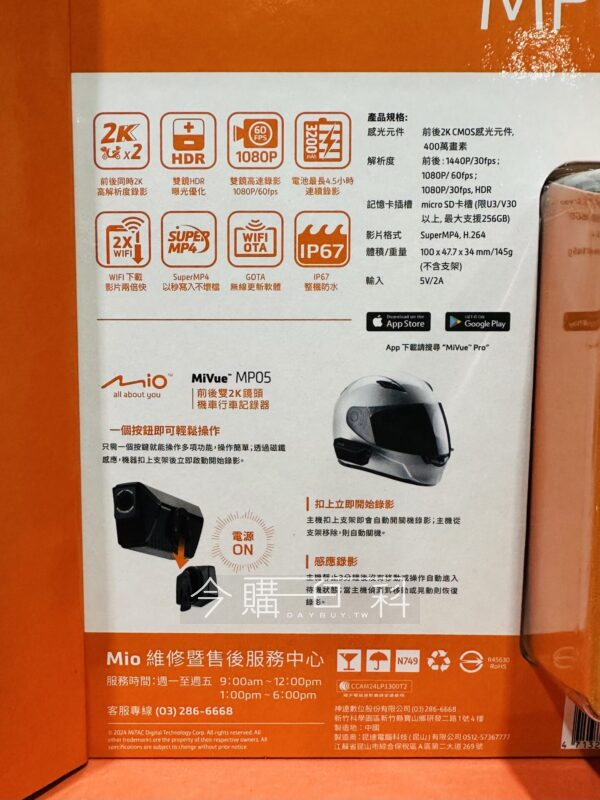 前後2K 1440P高解析度,內建WIFI OTA無線更新,最長可連續錄影4.5小時,全機IP67防水設計,扣上即錄影智慧開關機,SUPERMP4以秒寫入無壞檔。