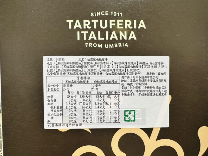 發煙點攝氏210度,適合義大利麵,海鮮料理,含黑&白松露風味橄欖油,可做調味、沙拉醬等使用,西式排餐,簡單增添香氣。