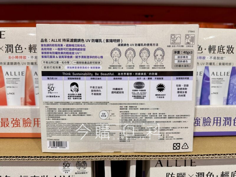 SPF50+ PA++++,兩色選擇:杏桃茜妍/紫陽明妍,輕底妝UV潤色兼防曬,校色暗沉修飾毛孔,日本製造。