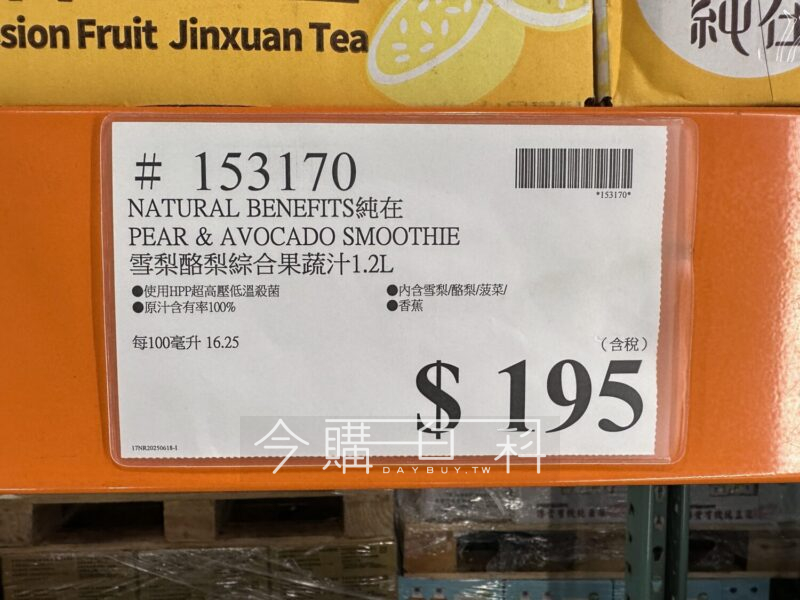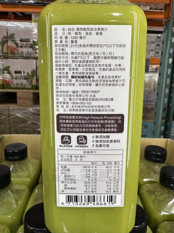 使用HPP超高壓低溫殺菌,原汁含有率100%,內含雪梨/酪梨/菠菜/香蕉。