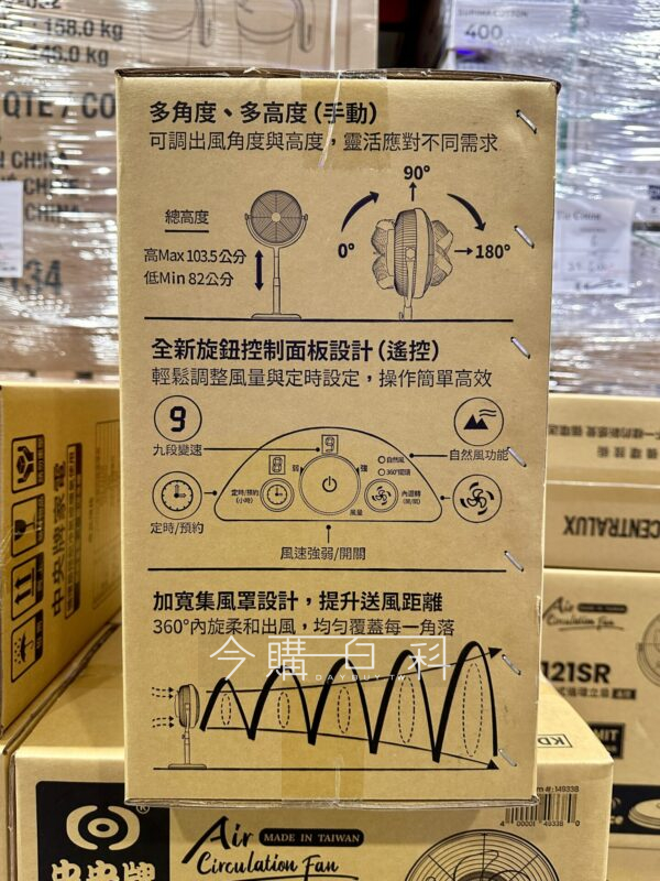 九段式風速選擇,360度內旋旋轉角度調整,特製圈狀網罩,降低風阻,DC直流變頻馬達,八小時定時預約開關機,內罩式馬達。