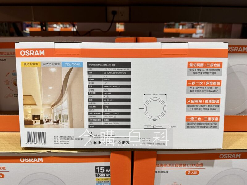 光通量:1500流明,色溫:6500K/4000K/3000K,安裝使用請詳閱商品說明裡,壽命約15000小時,壁切開關調整三種色溫。