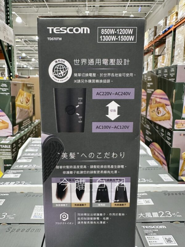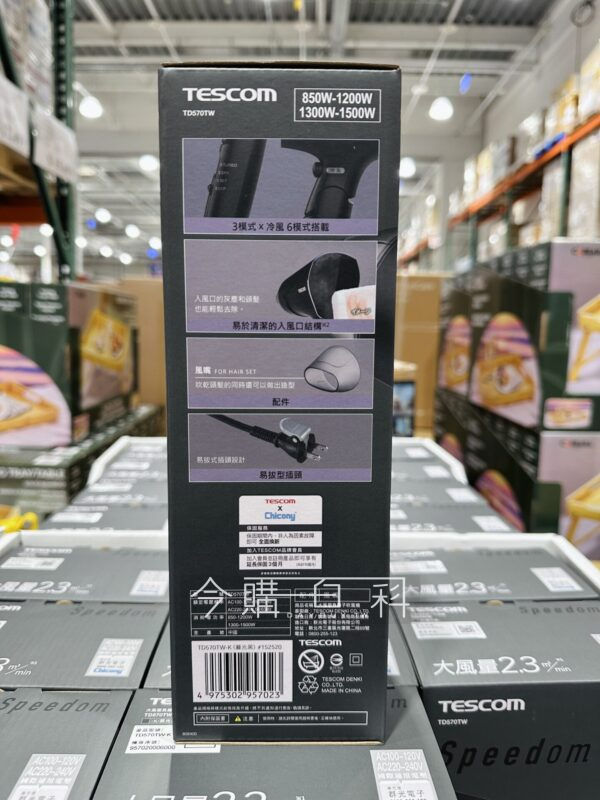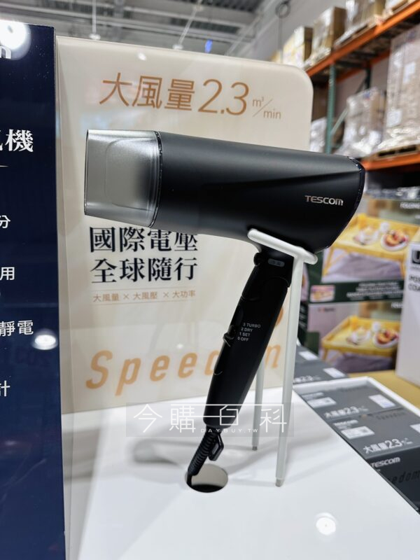 大風量2.3立方公尺/分,正負離子釋出、雙重修護,三段風量及六種模式,國際電壓可全球海外使用,重量:450克,可旋轉電,附吹嘴配件。