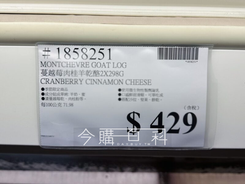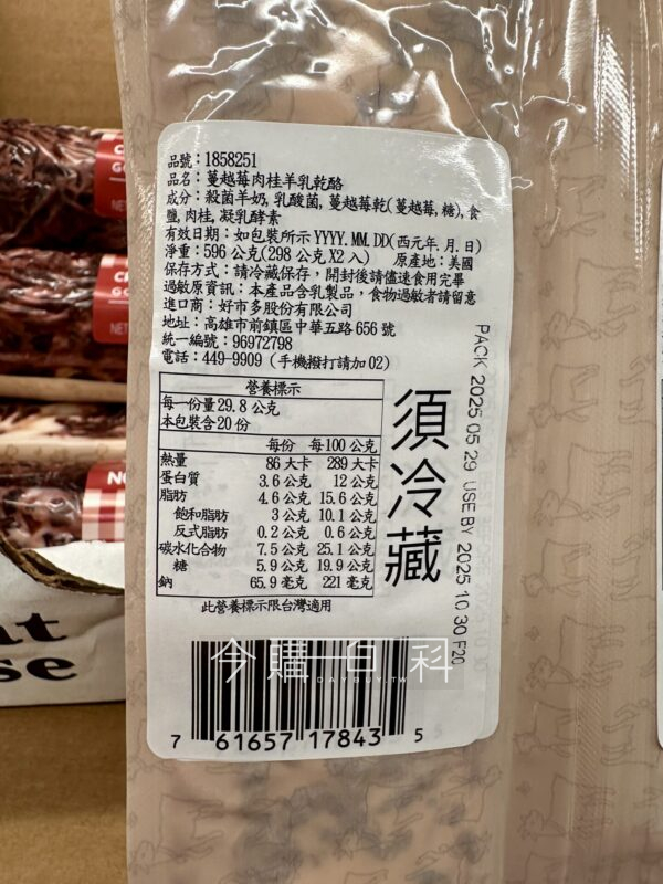 季節限定商品,成分組成單純:羊奶、蜜漬蔓越莓乾、肉桂粉等,使用微生物性製劑凝乳,口感鮮甜滑順,可單吃或搭配沙拉、堅果、餅乾。