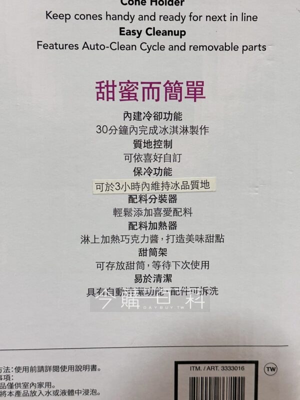 6種冰淇淋預設功能,30分鐘內快速製作,6小時保冷功能,無須預先冷凍,2公升大容量,自動清洗功能配件可拆洗。