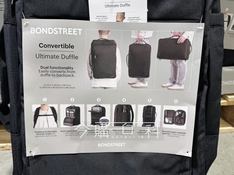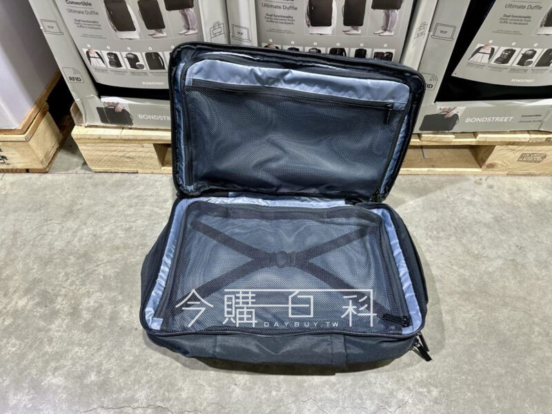 多隔層分類收納置物空間,上方與側邊皆有提把,內部壓縮鬆緊帶設計,可調式襯墊背帶,YKK拉鍊,可固定於行李箱拉桿上。