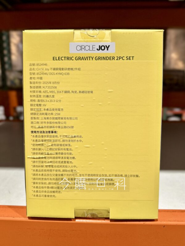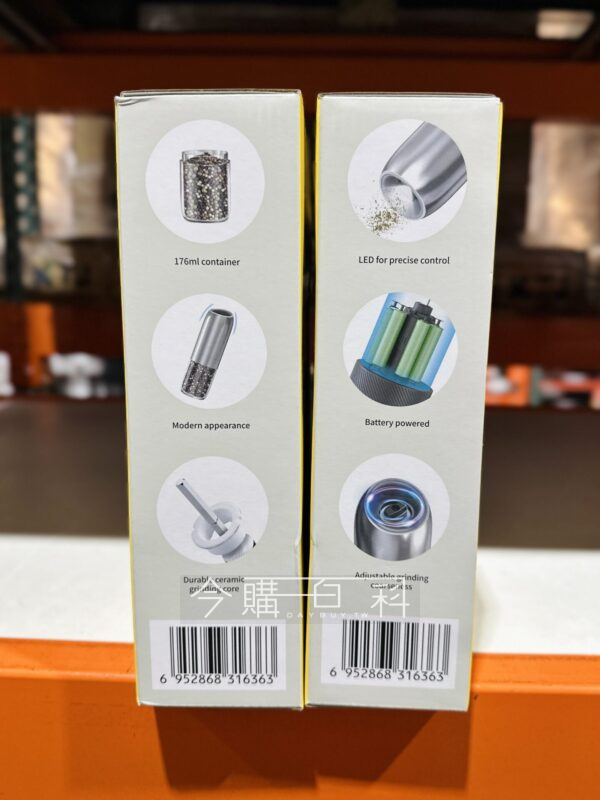 罐身傾斜即啟動研磨功能,可手動調整研磨粗細,耐用陶瓷研磨芯,不鏽鋼機身,玻璃儲存槽,可放胡椒、鹽或其他調味料,使用3A電池八入,需另購。