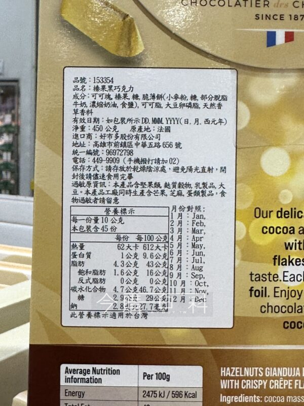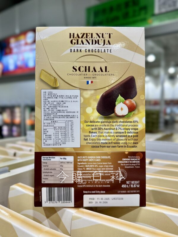 香濃黑巧克力搭配榛果,口感香醇絲滑,每顆獨立包裝,方便分享,產地:法國。