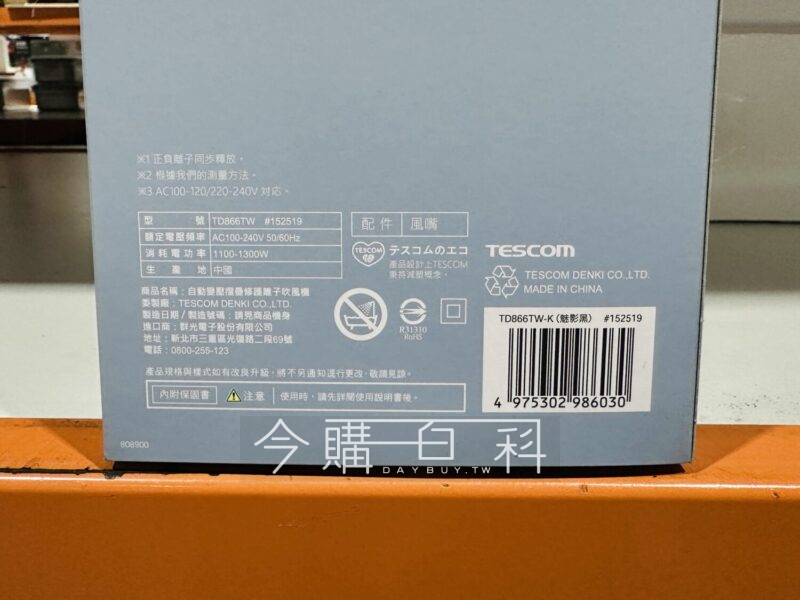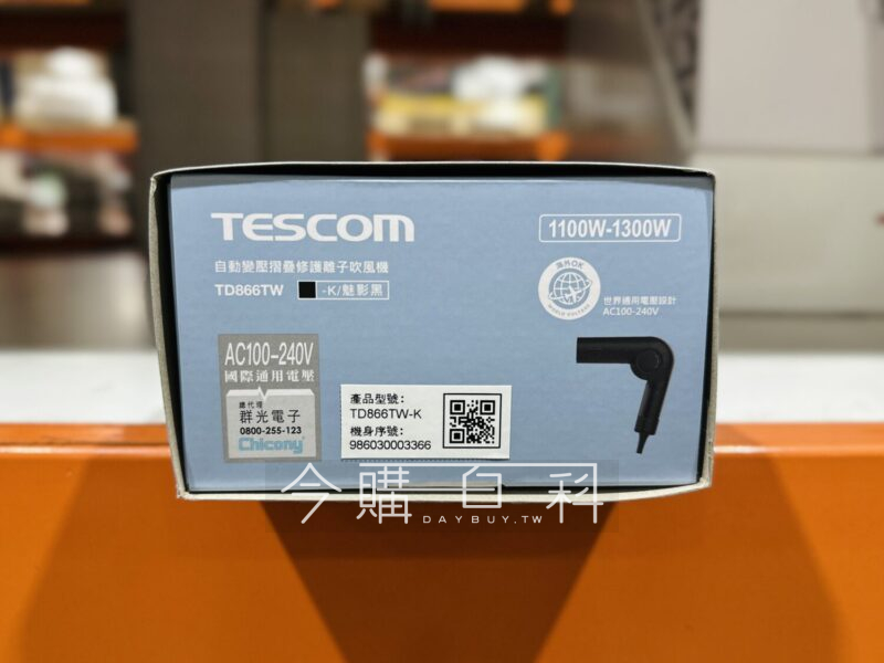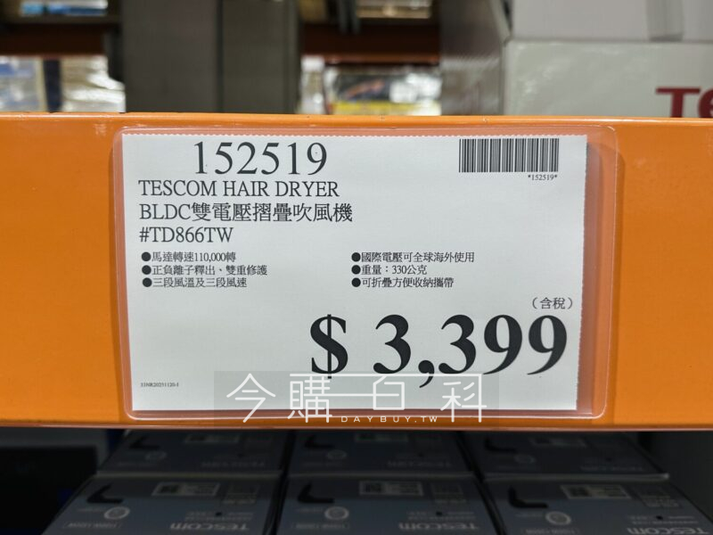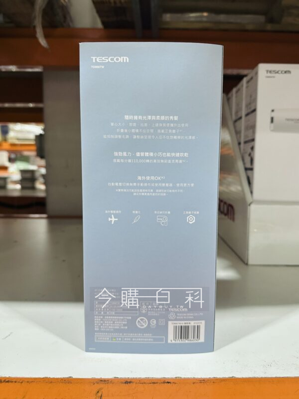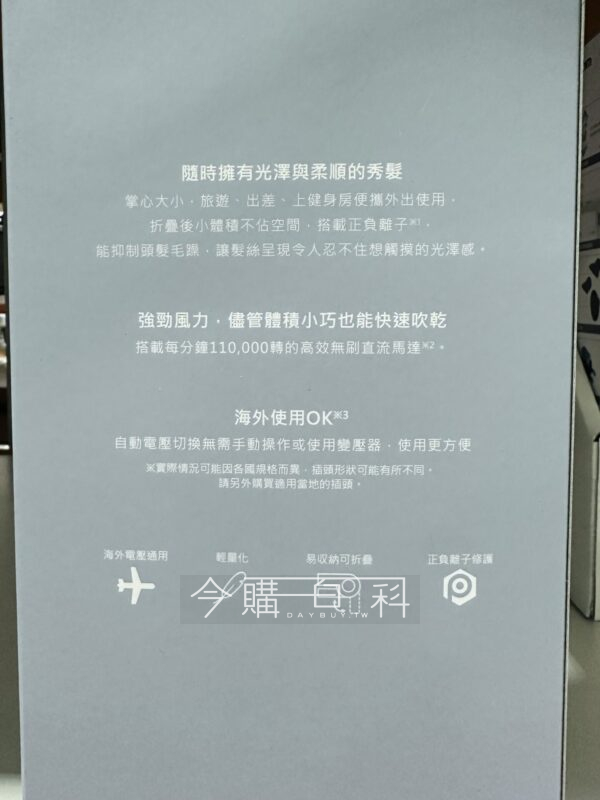 馬達轉速110,000轉,正負離子釋出、雙重修護,三段風溫及三段風速,國際電壓可全球海外使用,重量:330公克,可折疊方便收納攜帶。