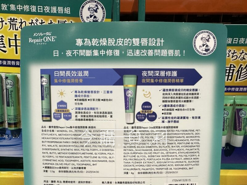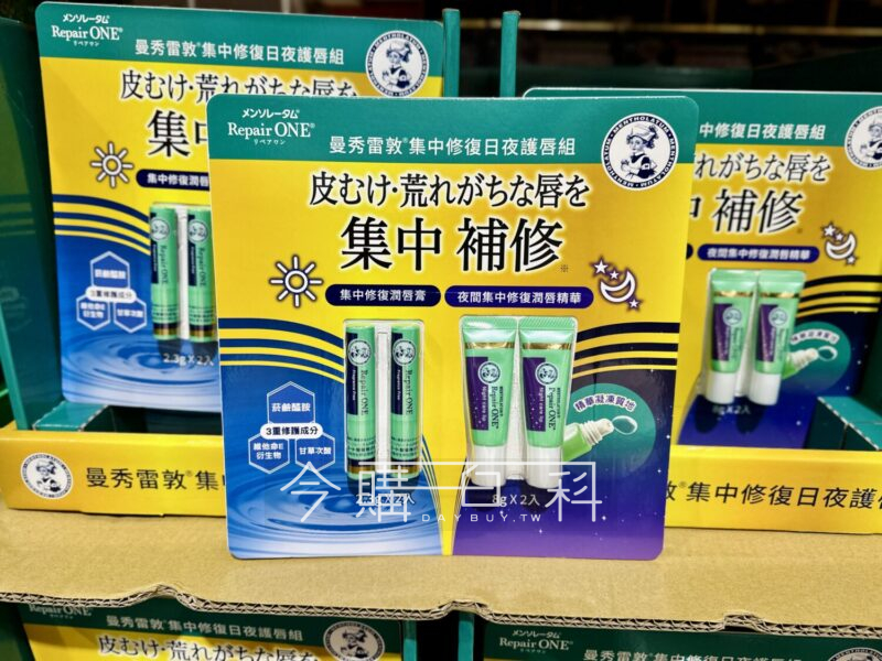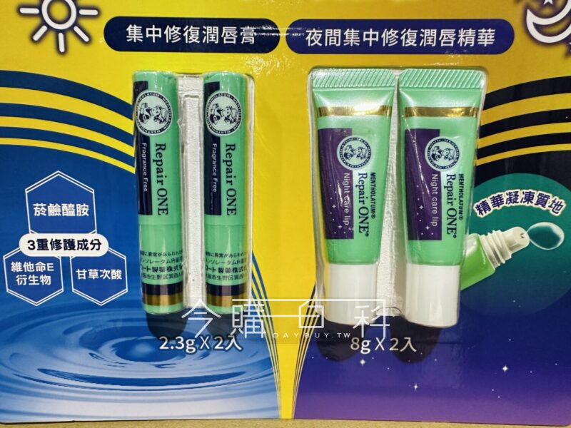 日間長效滋潤2.3G 2入,添加深層滋潤保濕配方,改善乾燥粗糙唇肌,夜間深層修護精華8G 2入,三種保濕成分添加,有效填補撫唇紋。