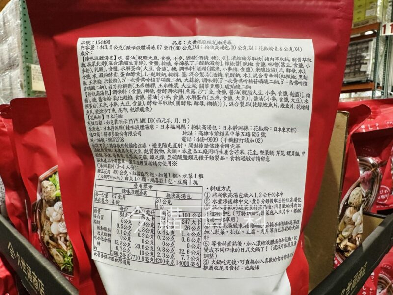 以豆瓣醬為基底,融合花椒油、辣椒油、大蒜,創造出麻辣與花椒香氣湯頭,共四份,每份含三種調味包,辣味液體湯包+粉狀高湯包及花椒粉,可任意搭配調理。